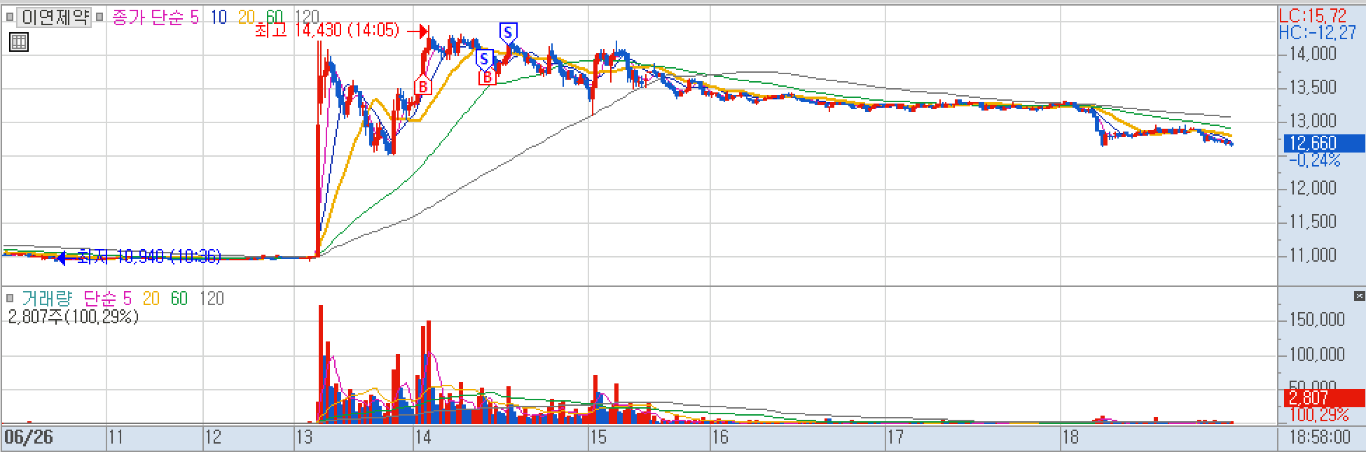상한가 한 번 풀리고 잠그길래 괜찮다고 생각했으나 또 풀려서 결국 전량 매도. >>> 이후에 상한가 다시 갔다. ㅠㅠ