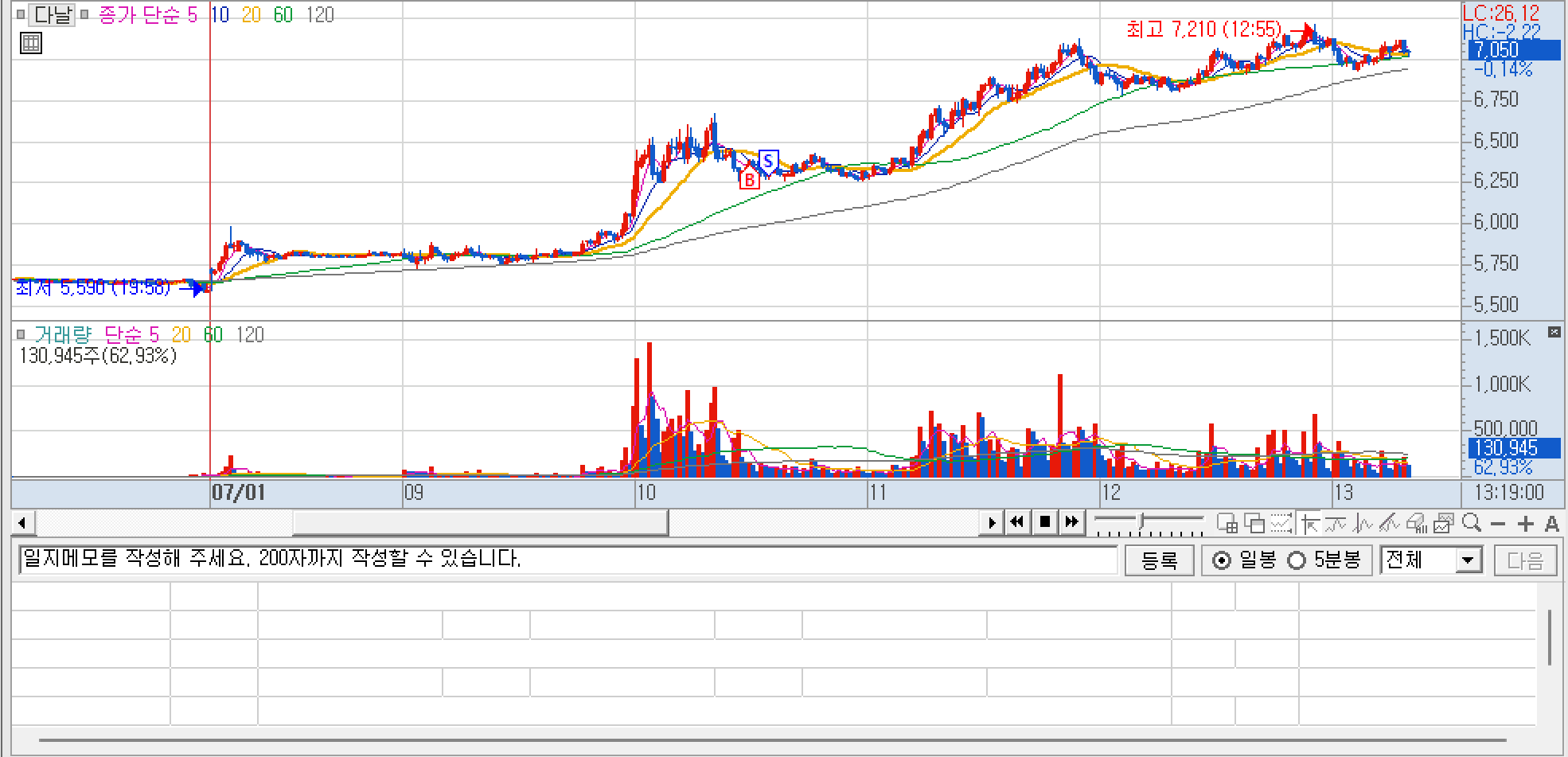 어제 상한가까지 가지고 있던 물량 갭뜨면 팔려고 했는데,,, 갭이 안떠서 그냥 매도. 이 후 안떨어져서 분할 매수 매도로 짧게 매매.