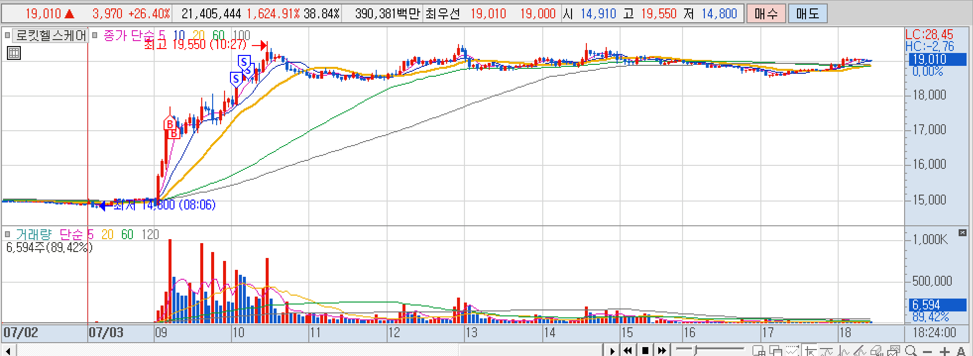 로킷헬스케어 : 오르길래 재료 확인하려고 기사쳐보니 2분전에 글로벌 최초 AI 피부암 재생치료 성공 기사 뜬거 보고 뒤늦게 매수. 재료가 매우 강하다고 생각. 두 번 분할매수 후 2차 VI 전후로 분할 익절.