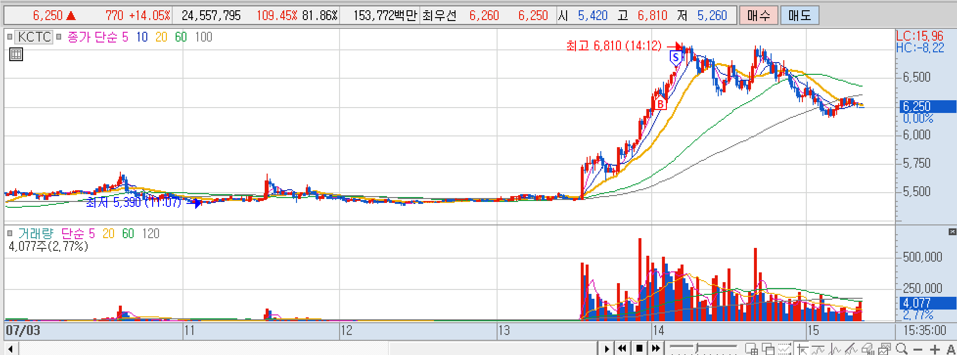 KCTC가 전고점 뚫고도 계속 올라서 전고점을 지지라인으로 생각하고 소액베팅. 2차 VI 자리가 얼마 안남아서 VI 풀릴 때 매도할 계획이었다. >>> 10프로 비중인줄 알았는데 실수로 몰빵으로 들어감. 다행히 VI 가주었고 풀리고 좀 오를 때 전량 익절.