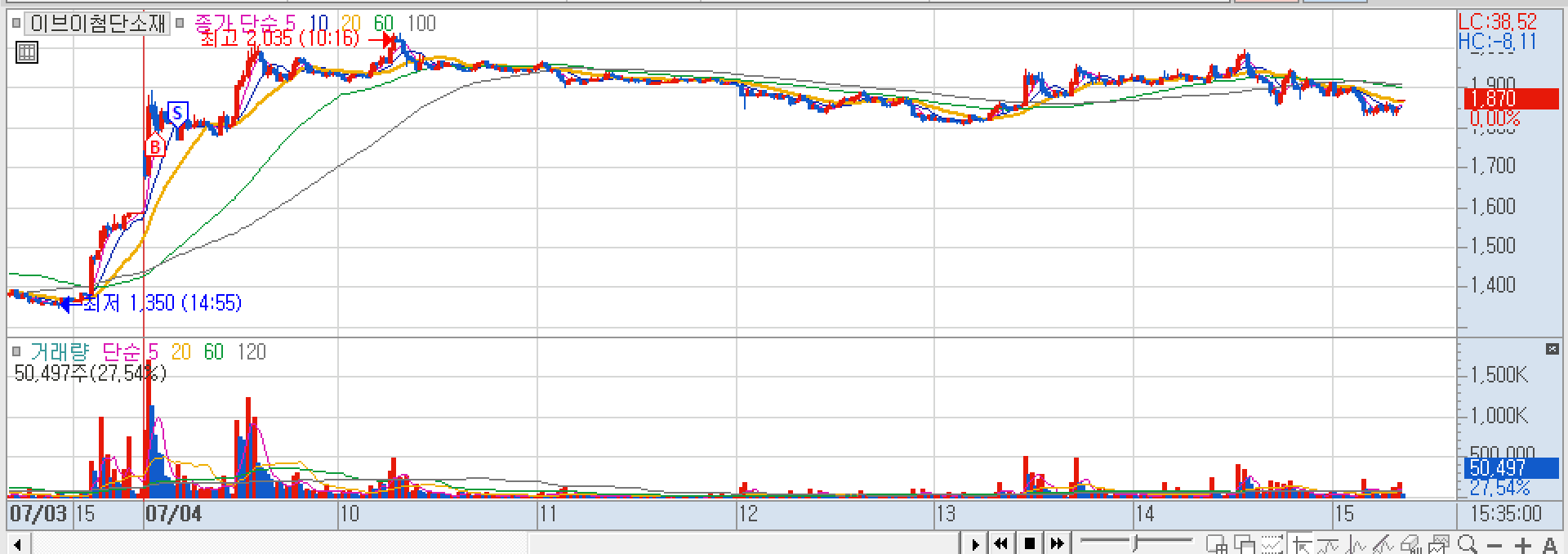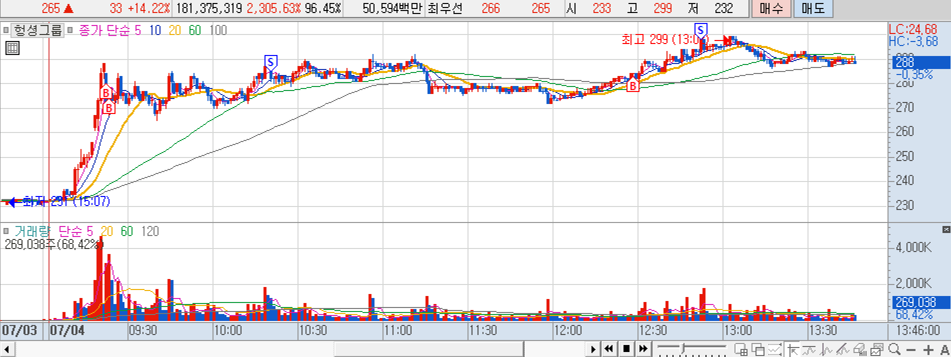 헝셩그룹 : 장초에 수급 좋아서 단타. (이 땐 중국 테마가 쎈줄 몰랐다. 로스웰이랑 둘만 가는줄). 오후에 얘 빼고 중국주 다 상한가 가길래 얘도 시세는 주겠다 생각. but 상한가는 못찍거나 찍어도 낼 갭안줄거라 생각해서 진입 후 28프로 부근 최고점에 매도.