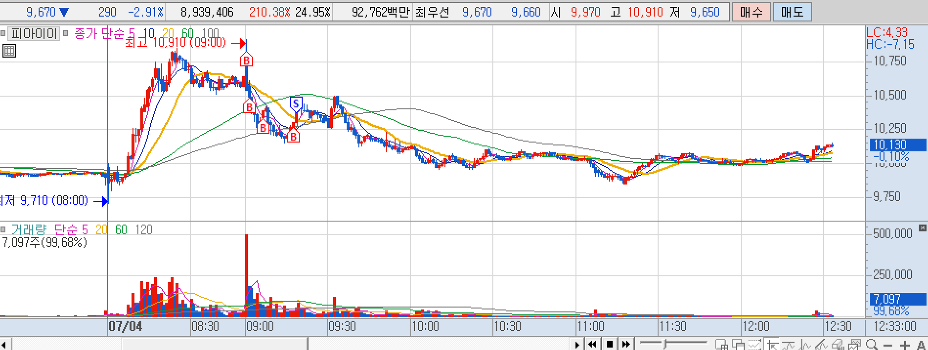 피아이이 전날 순매수 상위 종목이어서 주시하다가 상승 때 샀는데, 너무 늦게 들어가서 고점 살짝 뚫고 내려오는 전형적인 하락 국면에서 매수가 됐다,,,, 지지라인마다 비중 더해서 본절 매도.
